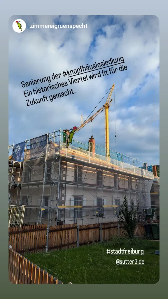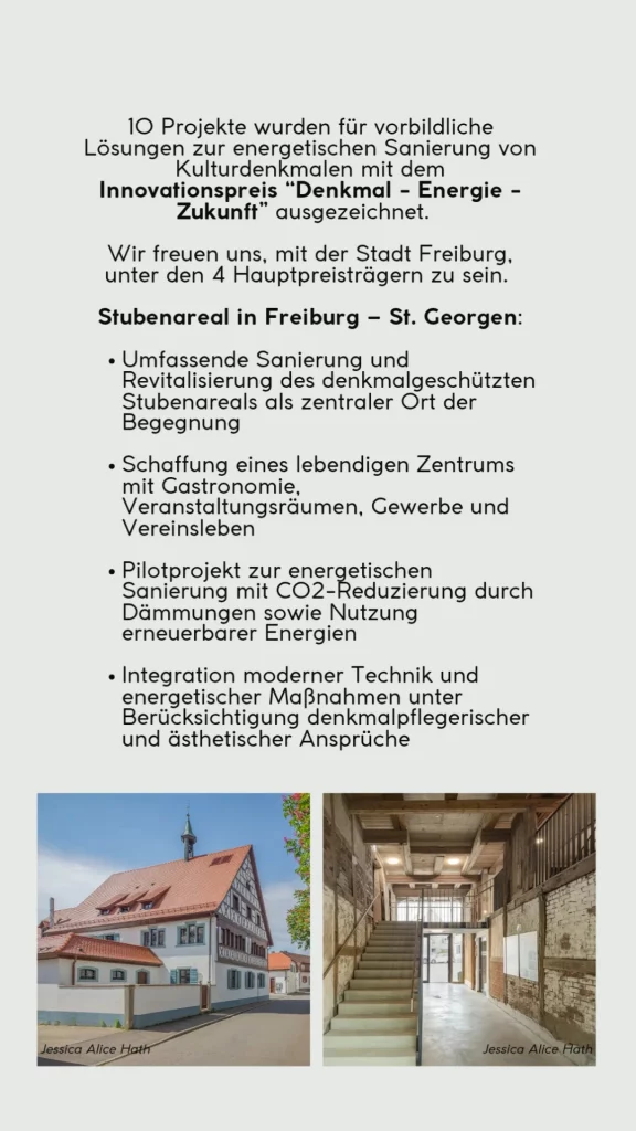 Die denkmalgeschützte Siedlung mitten in Freiburg vereint Denkmalpflege, Klimaschutz und sozialen Zusammenhalt. 106 Wohnungen wurden energetisch modernisiert und denkmalgerecht saniert. Möglich wurde das durch Fördermittel von Bund, Land, Kommune und der KfW. Die Mieterschaft war über einen Sanierungsbeirat eng eingebunden. „Mit der Sanierung der Knopfhäusle-Siedlung zeigen wir, dass es möglich ist, historischen Wohnraum zu erhalten, energetisch zu modernisieren und dabei soziale Verantwortung zu übernehmen. Dass unser Projekt bundesweit als vorbildlich angesehen wird, freut uns sehr – und motiviert uns, diesen Weg in Freiburg konsequent weiterzugehen“, so Oberbürgermeister Martin W. W. Horn.
