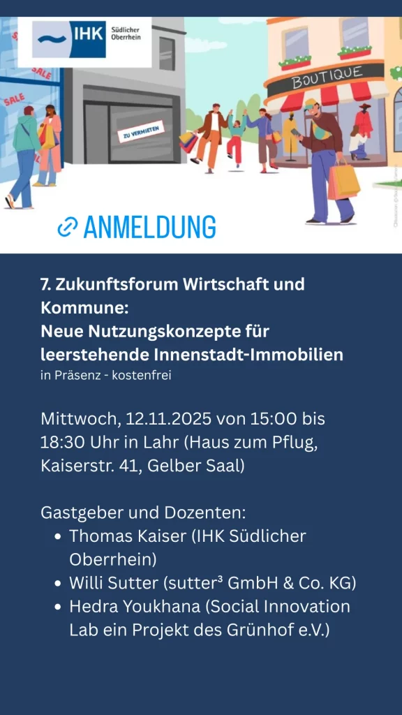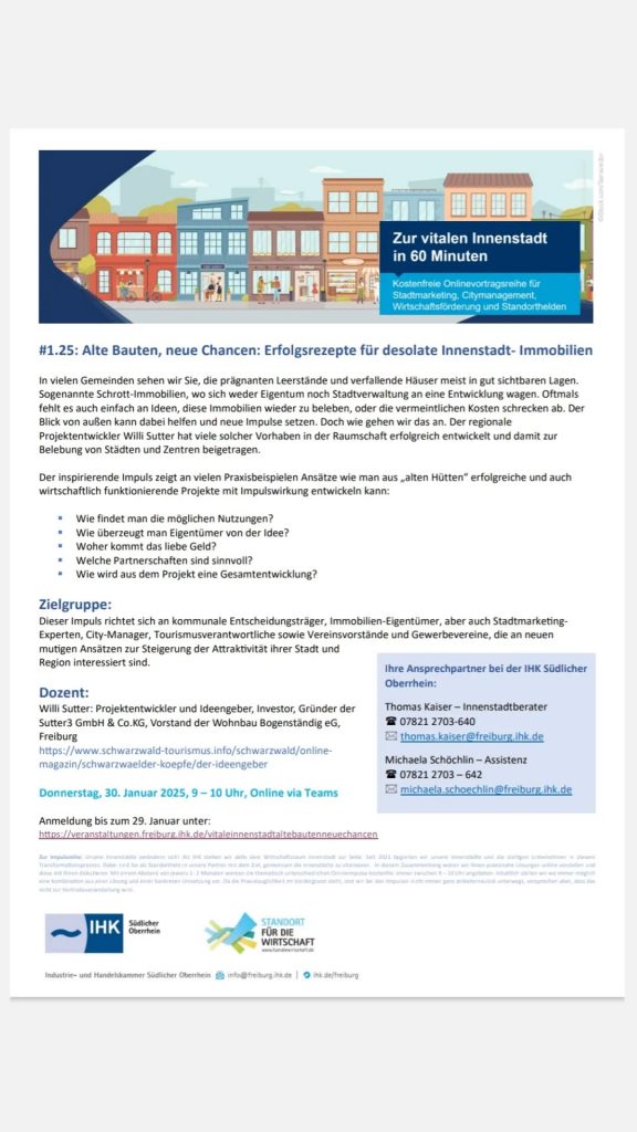Die IHK Südlicher Oberrhein bietet einen kostenlosen Online-Impuls für alle, die aktiv zur Attraktivitätssteigerung ihrer Städte beitragen möchten. Der erfahrene Projektentwickler Willi Sutter teilt seine Erfolgsstrategien und beantwortet die dringendsten Fragen. Ihre Vorteile: