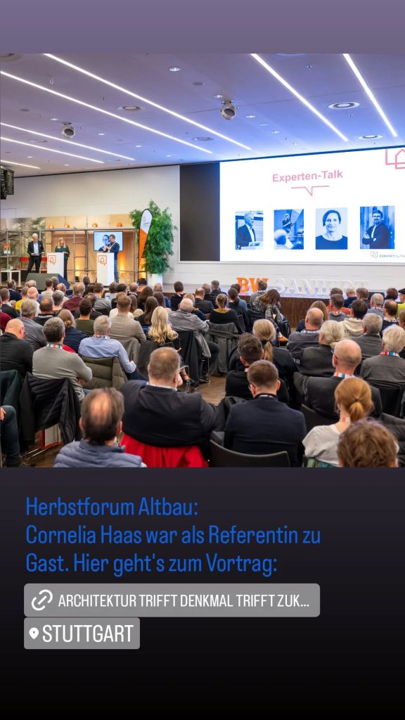 Cornelia Haas war am 20.11.2024 als Referentin zu Gast beim Herbstforum Altbau in Stuttgart. Sie durfte in ihrem Vortrag darlegen, wie auch denkmalgeschützte Gebäude wirkungsvoll saniert werden können und dies an umgesetzten Projekten aufzeigen. Im Anschluss fand eine Diskussion im Rahmen eines Experten-Talks statt.