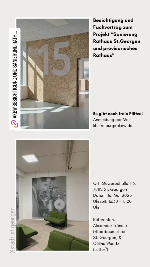 Am vergangenen Samstag wurde der offizielle Spatenstich für die Rathaus – Sanierung in St. Georgen gefeiert. Außerdem wurde eine Führung durch das Interimsgebäude „A.Maier“ angeboten. Dabei konnten die Besucher einen Eindruck davon gewinnen, wie die vorübergehenden Räumlichkeiten aussehen und wie sie genutzt werden, während die eigentlichen Bauarbeiten laufen. Das Interimsgebäude dient als Übergangslösung, um den Betrieb während der Sanierung aufrechtzuerhalten.