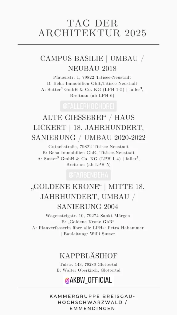 Die prämierten Projekte im Auszeichnungsverfahren „Beispielhaftes Bauen“ Landkreis Breisgau-Hochschwarzwald und Emmendingen aus den Jahren 2015 – 2023 sind im Rahmen der Wanderausstellung vom 05. – 14. Juli in der BDB-Musikakademie in Staufen zu sehen.