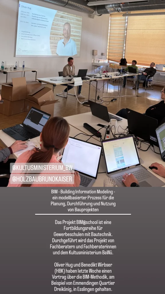Oliver Hug von sutter³ und Benedikt Wirbser (Holzbau Südwest) stellten vor, wie man mehrgeschossige Wohnbauten wirtschaftlich mittels eines Digitalen Zwillings und vernetzter Planung im Building Information Modeling (BIM) planen und umsetzen kann.